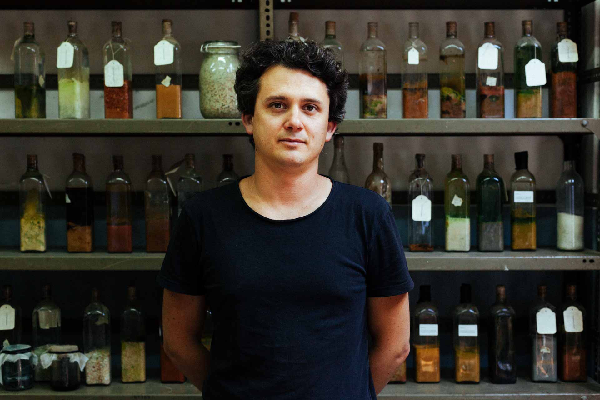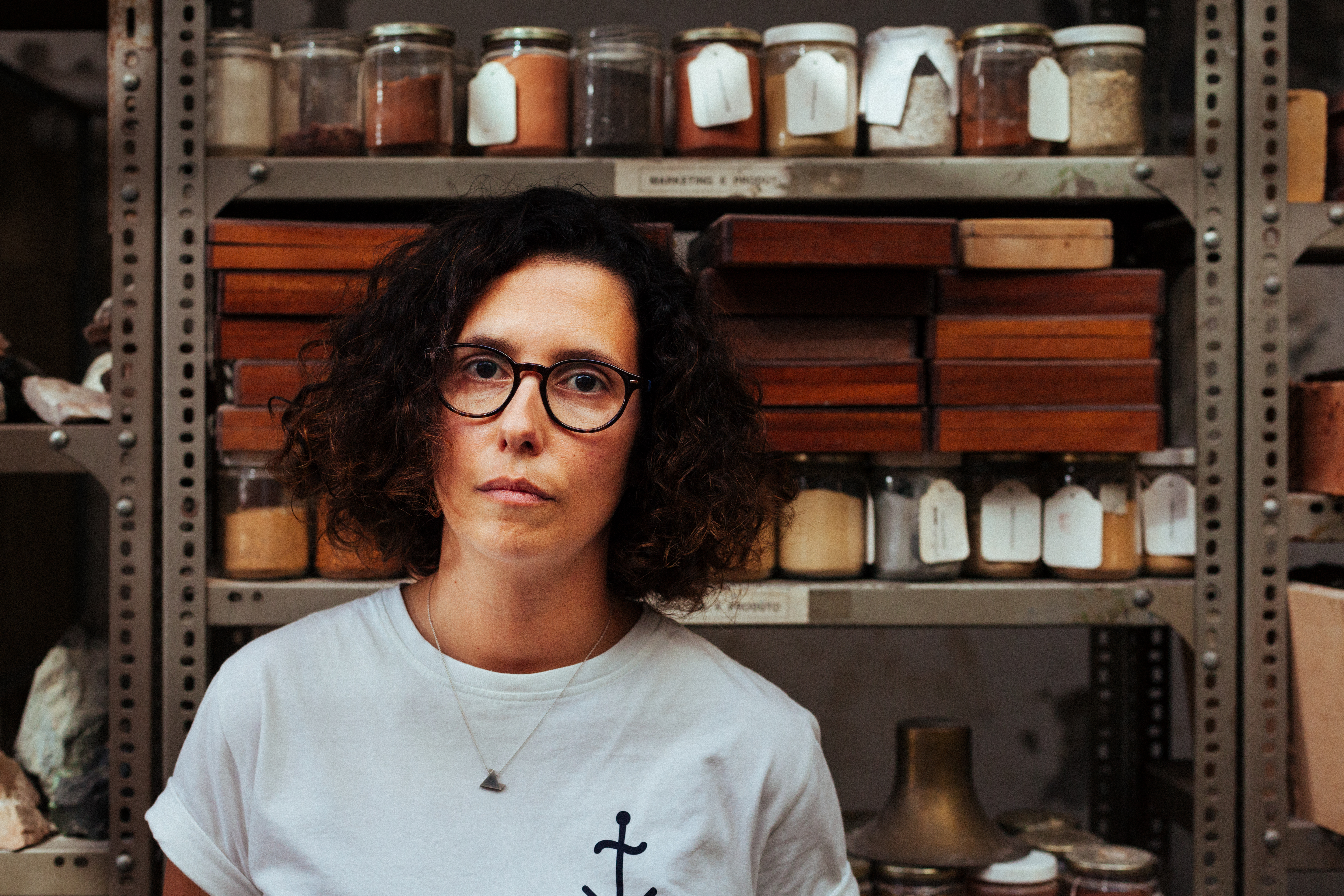 Foi o que aconteceu na Adega dos Lagares? “Foi. O que vocês veem aqui à nossa volta é fruto dessa pesquisa maioritariamente materialística, mas há muito conhecimento imaterial na sociedade, o conhecimento de como se fazem as coisas, aí as pessoas são as peças mais importantes.” As entrevistas com Pedro, e depois com Lara. aconteceram numa sala onde forrada a garrafas com vários tipos de terra, um gabinete de curiosidades que esperaríamos encontrar na cave de um alquimista, mas que revela o modus operandi da Skrei. E assim passamos a palavra a Lara Jacinto: “O relicário resultou de uma viagem do Pedro e do Francisco por Portugal, em que fizeram uma recolha de amostras de várias solos e criaram um mostruário de características do território português. Este trabalho é um ato simbólico muito interessante, que mostra bem a forma como a Skrei atua, essa procura e entendimento do sítio onde se trabalha, em vez de importar processos pré-definidos. É uma leitura da realidade e depois uma adaptação a essa realidade.”